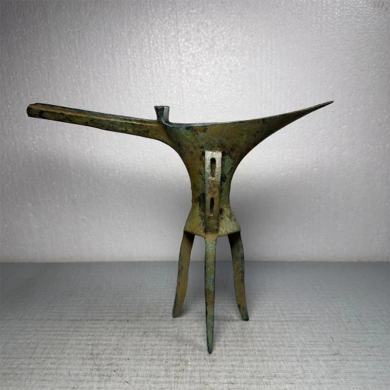 It is a type of ancient Chinese vessel used to serve warm wine during ancestor-worship ceremonies. It is ovoid in shape, supported by three splayed triangular legs, with a long curved spout on one side and a balance flange on the other.